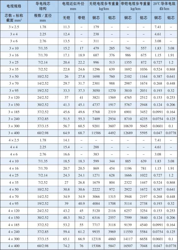 8.1 VV/VV22(VLV/VLV22)型0.6/1kV 挤包电力电缆规格性能表