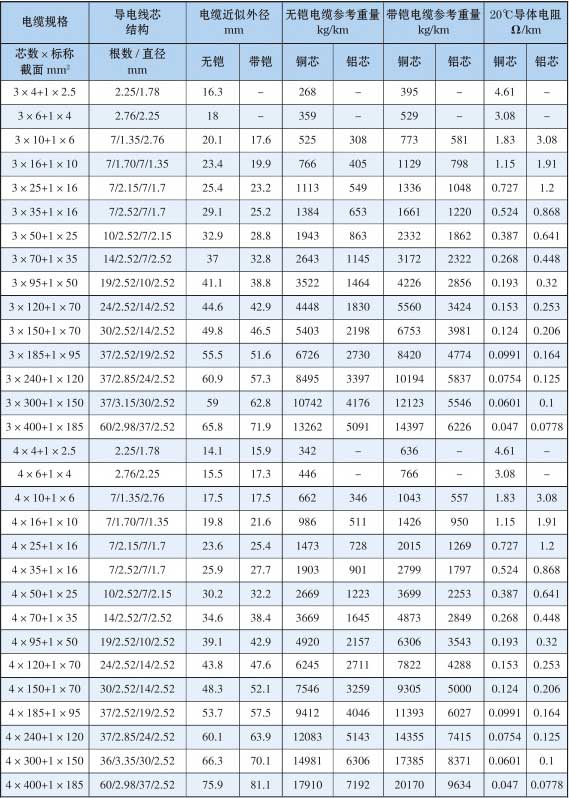 8.2 YJV/YJV22(YJLV/YJLV22)型0.6/1kV挤包电力电缆规格性能表